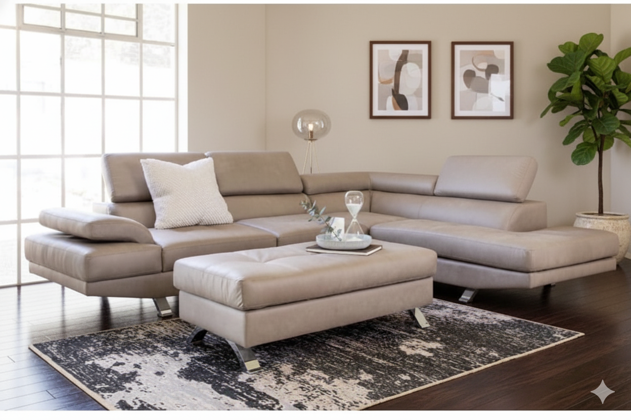 The Leonardo Ottoman is the perfect companion to the Leonardo 2-Piece Corner Suite, offering both versatility and refined style. Designed to complement the suite’s sleek modern aesthetic, it features the same premium upholstery, clean lines, and metallic detailing for a seamless, coordinated look. Whether used as a footrest, additional seating, or even a stylish coffee-table alternative, the Leonardo Ottoman adds function and flair to your living space. Crafted for durability and everyday comfort, it’s a versatile accent piece that elevates your home’s modern appeal.