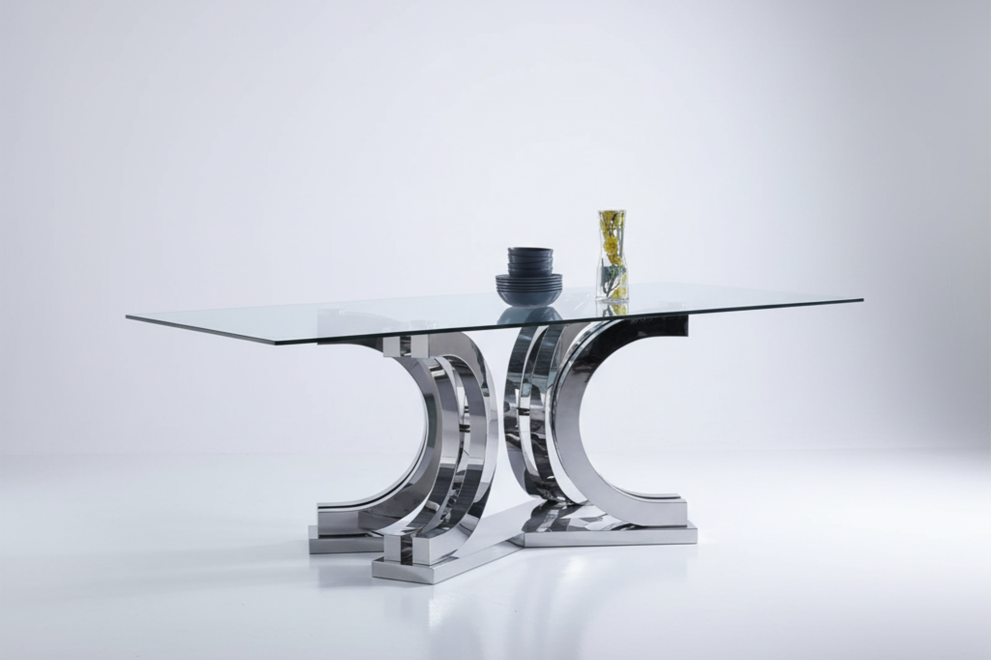 • Statement Table: Features a clear glass tabletop supported by a bold, unique mirrored chrome pedestal base (split curve design).