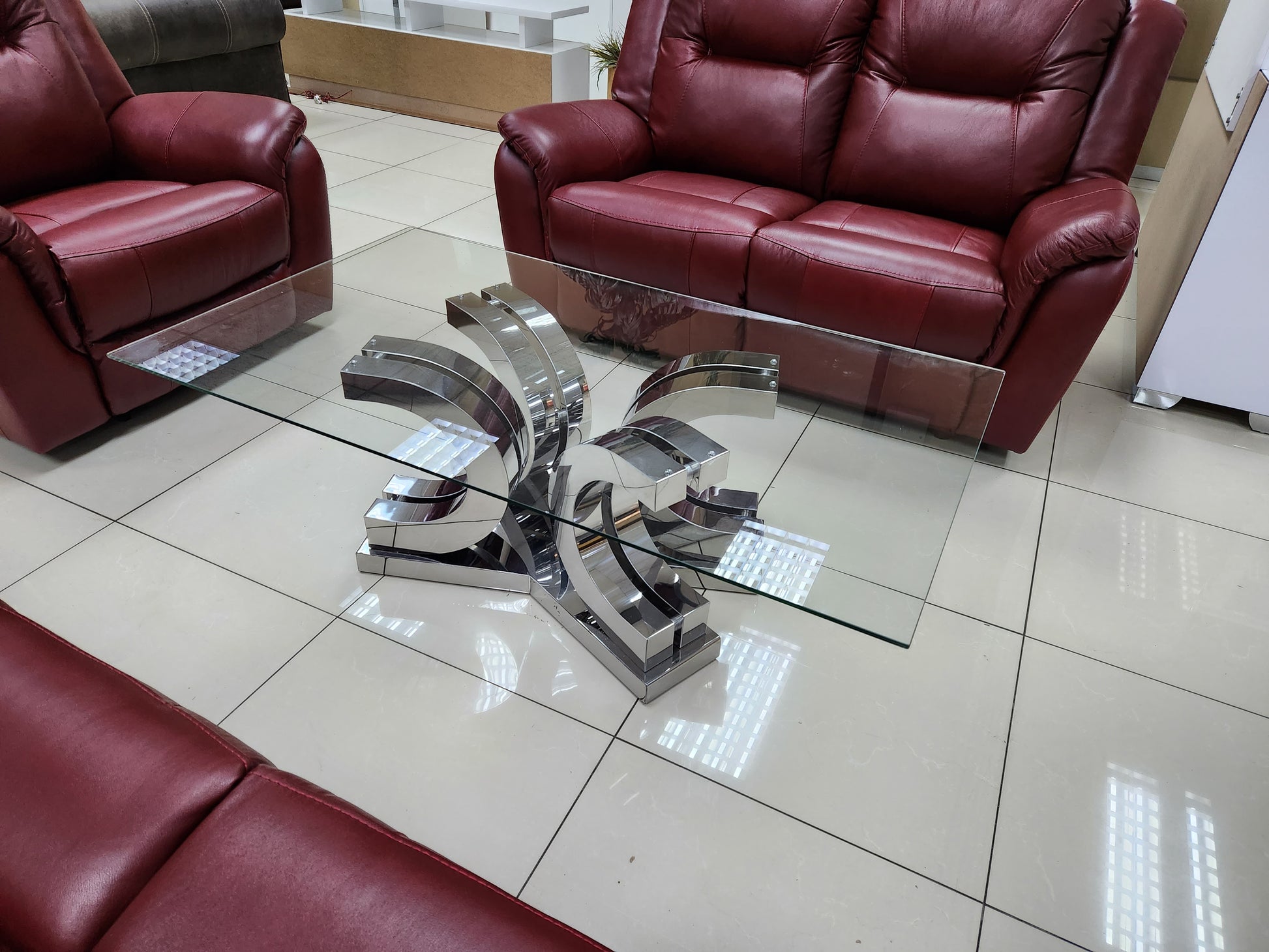 • Base Construction: The base consists of large, stylized, curved metal forms in a reflective chrome finish.